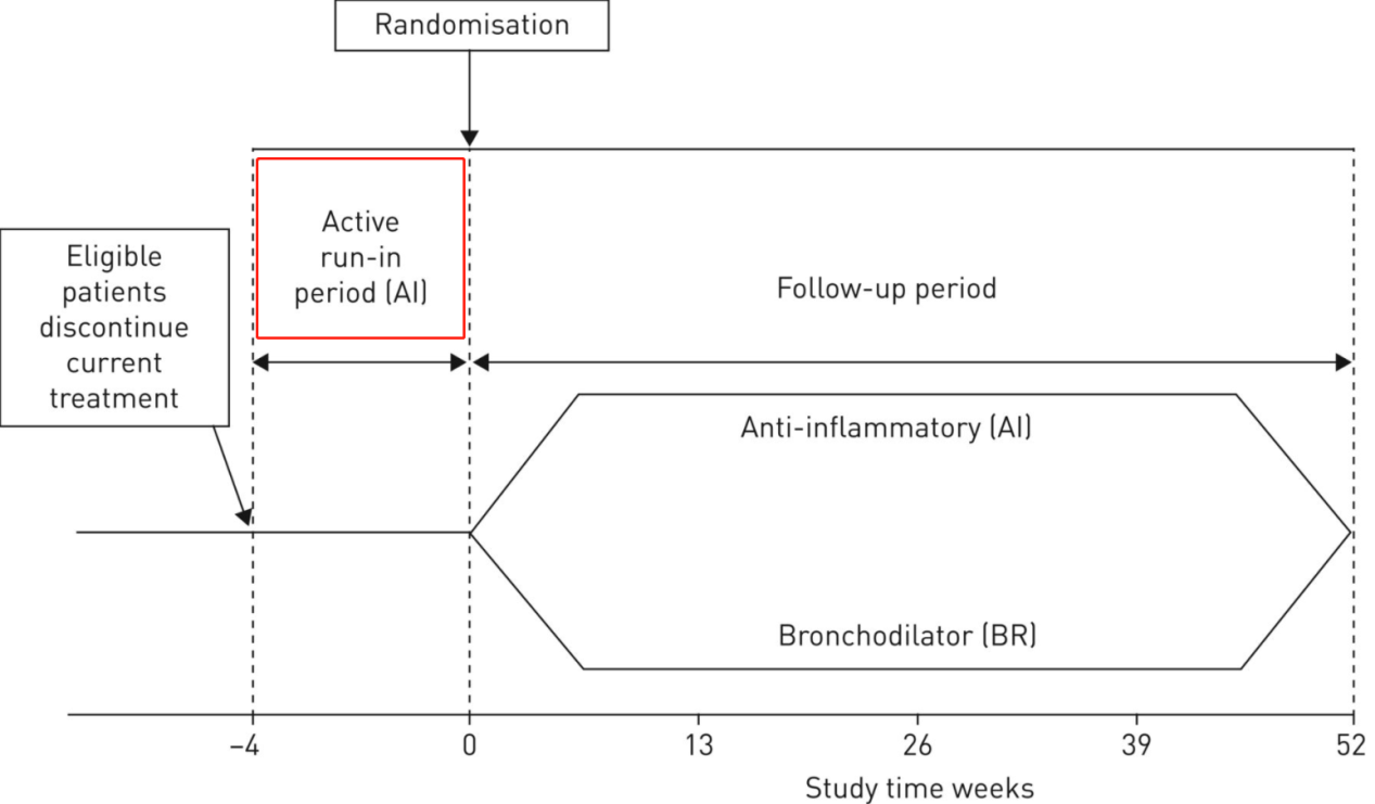 ▲ 比較抗炎藥(AI)與支氣管擴張劑(BR)有效性的隨機對照試驗,試驗藥物治療之前受試者先進入為其4周的導入期