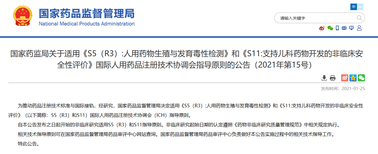 關(guān)于適用《S5(R3):人用藥物生殖與發(fā)育毒性檢測(cè)》和《S11:支持兒科藥物開發(fā)的非臨床安全性評(píng)價(jià)》國(guó)際人用藥品注冊(cè)技術(shù)協(xié)調(diào)會(huì)指導(dǎo)原則的公告(2021年第15號(hào))