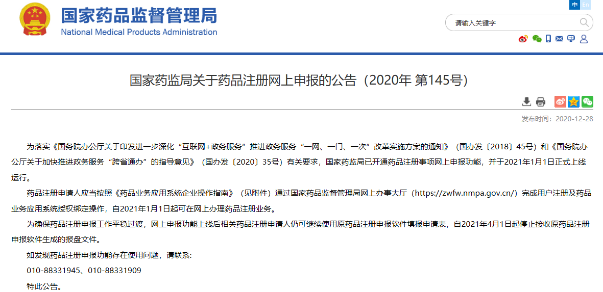 為落實《國務院辦公廳關于印發進一步深化“互聯網+政務服務”推進政務服務“一網、一門、一次”改革實施方案的通知》(國辦發〔2018〕45號)和《國務院辦公廳關于加快推進政務服務“跨省通辦”的指導意見》(國辦發〔2020〕35號)有關要求,國家藥監局已開通藥品注冊事項網上申報功能,并于2021年1月1日正式上線運行。