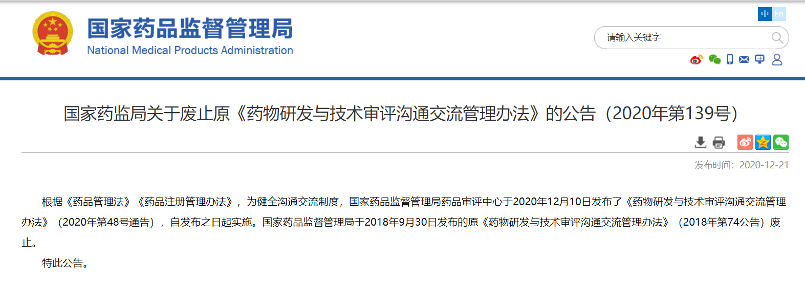 關于廢止原《藥物研發與技術審評溝通交流管理辦法》的公告(2020年第139號)