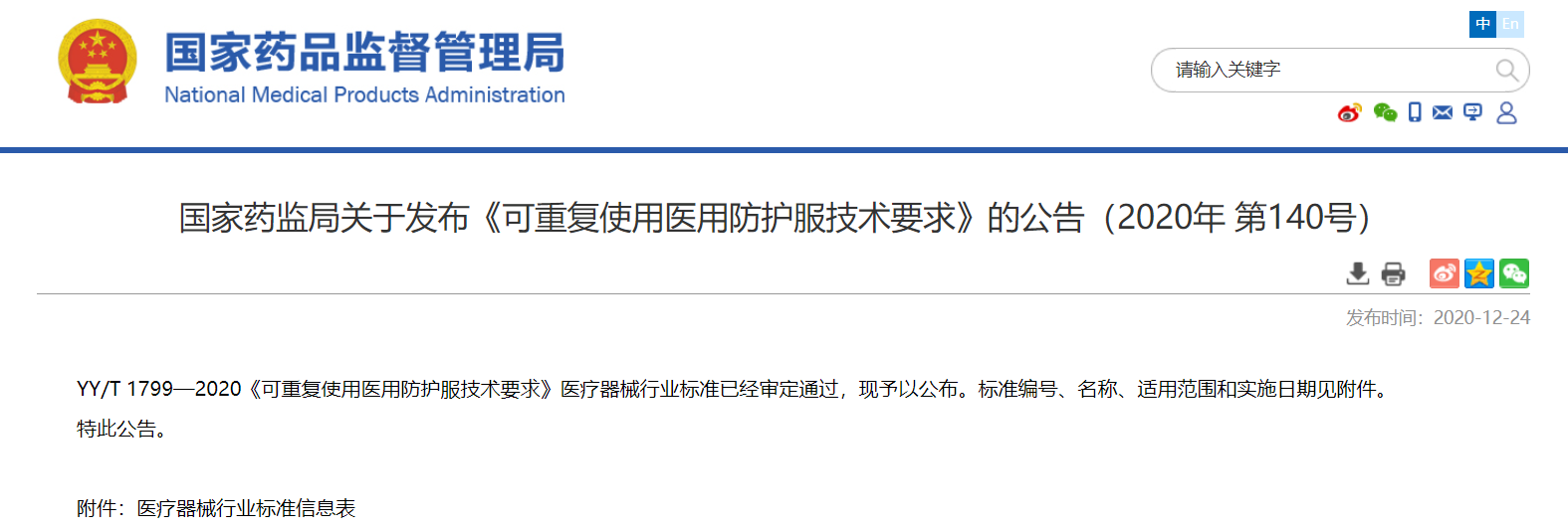 關于發布《可重復使用醫用防護服技術要求》的公告(2020年第140號)