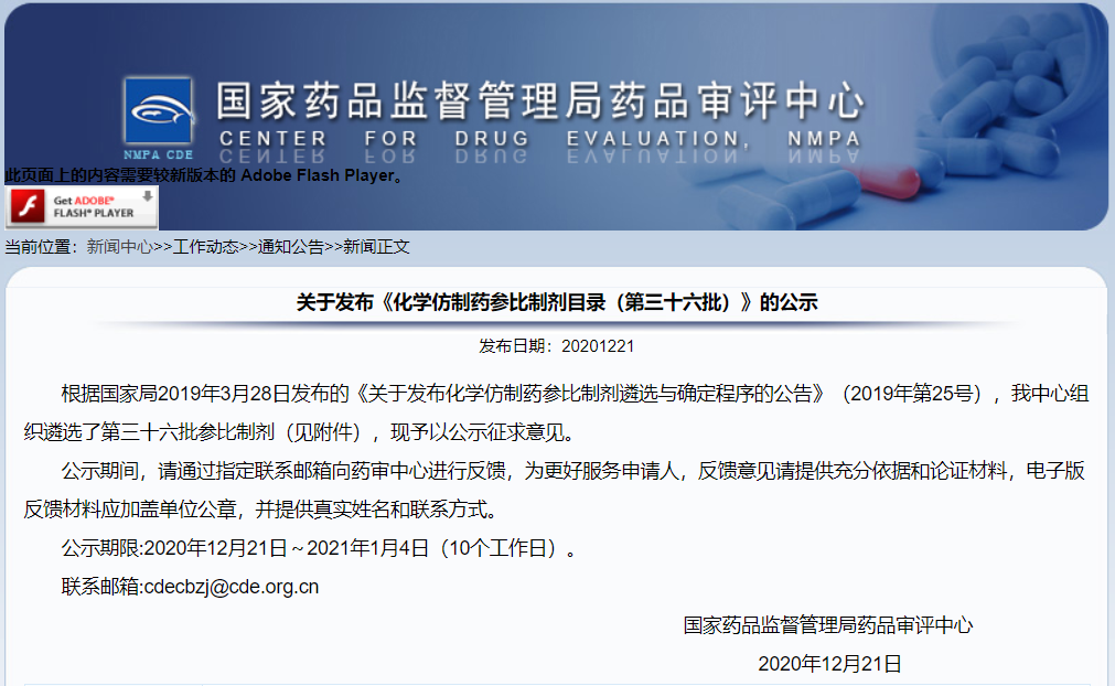 發布《化學仿制藥參比制劑目錄(第三十六批)》的公示