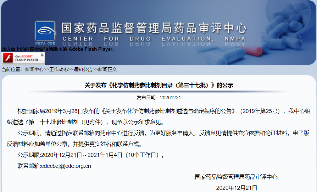 關于發布《化學仿制藥參比制劑目錄(第三十七批)》的公示