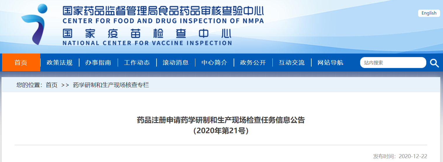 藥品注冊申請藥學研制和生產現場檢查任務信息公告(2020年第21號)