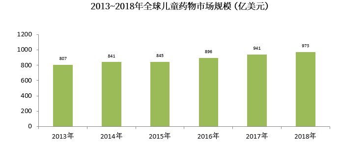 2013年~2018年全球兒童藥物市場規(guī)模呈逐年上升趨勢,近5年復合增長率(CAGR)為3.76%,2018年全球兒童藥物市場規(guī)模約為973億美元。