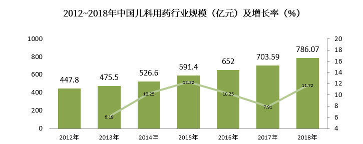國內市場兒童藥物規(guī)模與國際市場相匹配,2012年~2018年CAGR為+9.83%,2018年我國兒科用藥市場規(guī)模約為786.07億元,較上年同比增長11.72%,國內兒科用藥市場規(guī)模增長迅速。