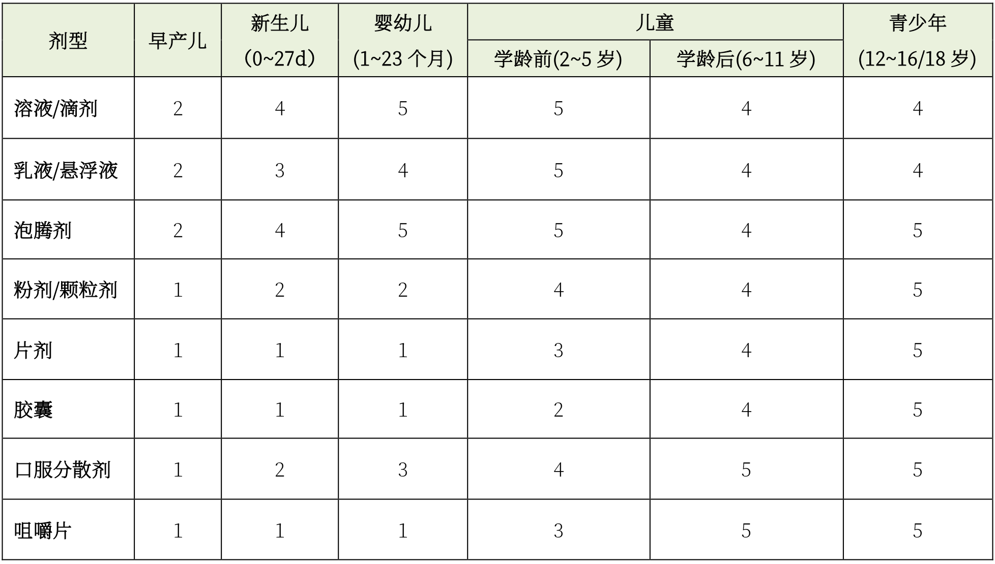 歐盟針對不同年齡段兒童進行了劑型(口服給藥途徑)推薦:
