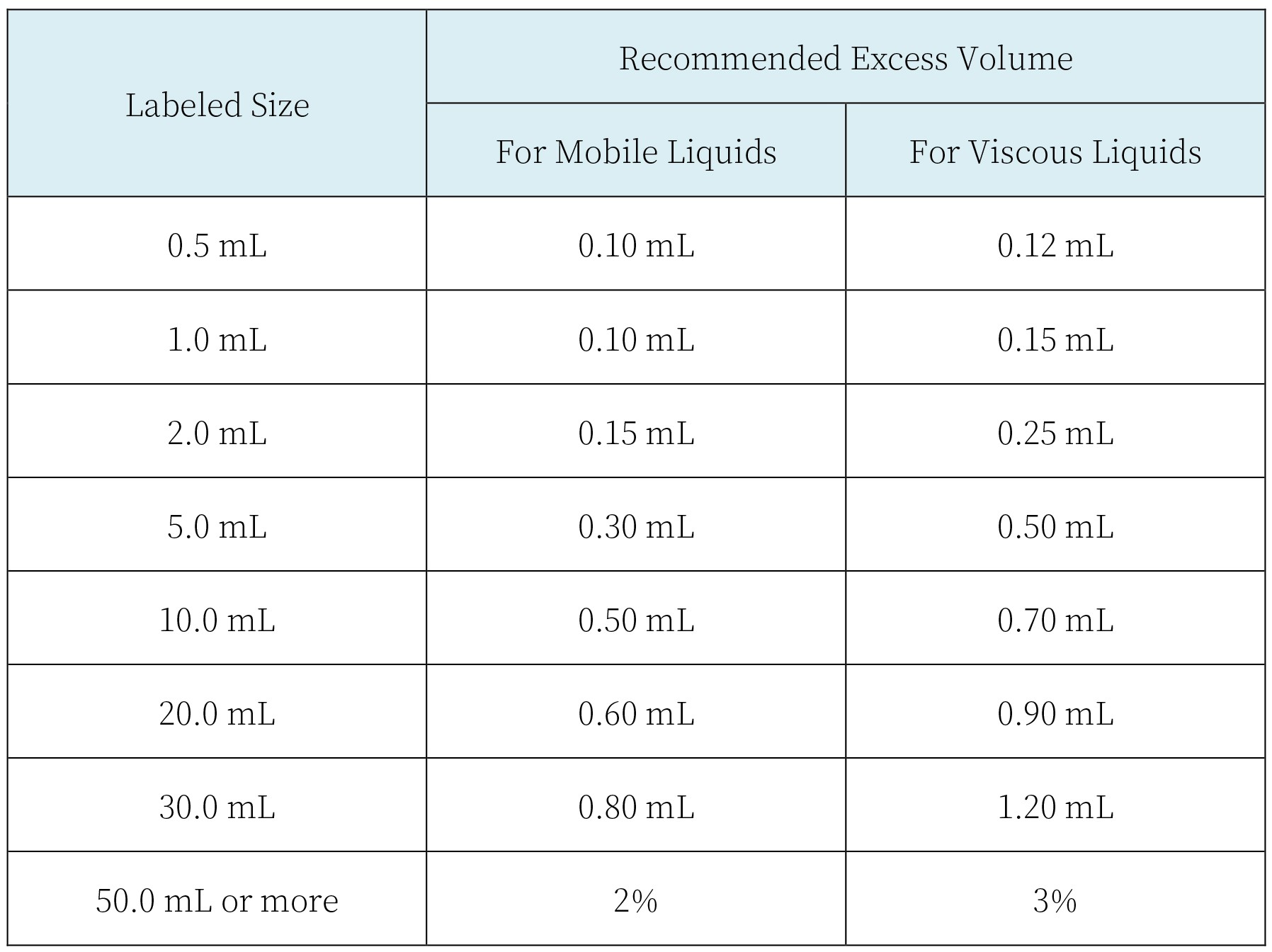 〔2〕USP General Chapter<1151>: Each container of an injection is filled with a volume in slight excess of the labled “size” or the volume that is to be withdrawn. The excess volumes recommended in the accompanying table are usually sufficient to permit withdrawal and administration of the labeled volumes.