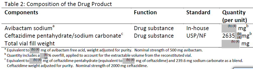 FDA審評報告明確本品存在過量灌裝(overfill),account for the extractable volume from the reconstituted vial(目的是使復溶后可抽取體積滿足要求),根據FDA提供數據,計算頭孢他啶和阿維巴坦過量灌裝量約為2%。