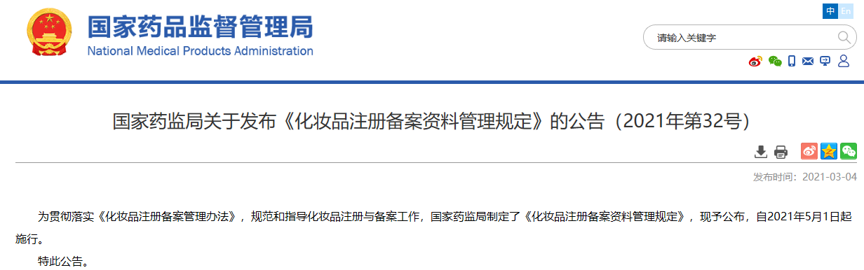 關(guān)于發(fā)布《化妝品注冊(cè)備案資料管理規(guī)定》的公告(2021年第32號(hào))