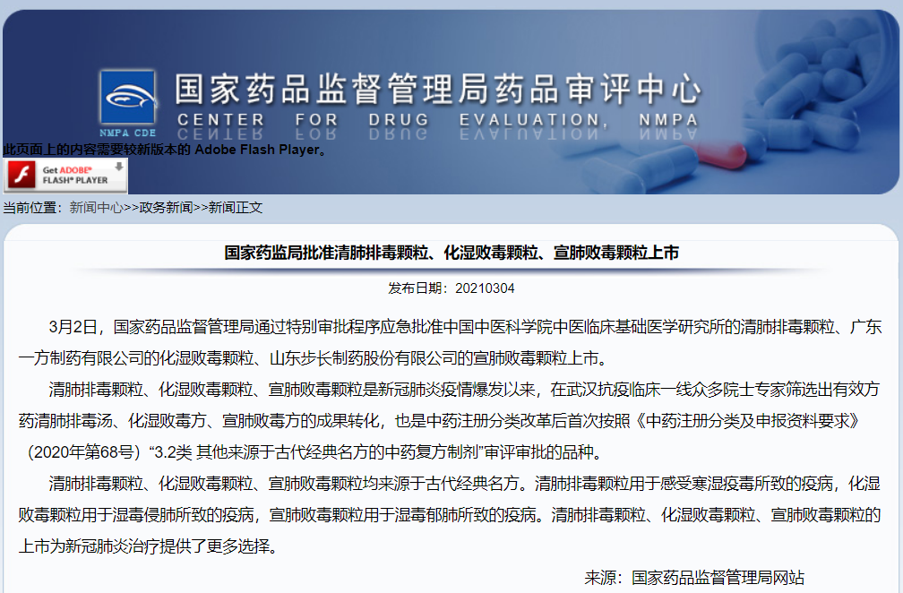 國(guó)家藥監(jiān)局批準(zhǔn)清肺排毒顆粒、化濕敗毒顆粒、宣肺敗毒顆粒上市