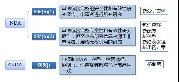 在美國,505法案(即《聯(lián)邦食品、藥品、化妝品法案》第5章第505分章)中,化學(xué)藥品可分為以下3種申請類別,其中NDA包括505(b)(1)和505(b)(2),ANDA為505(j)。