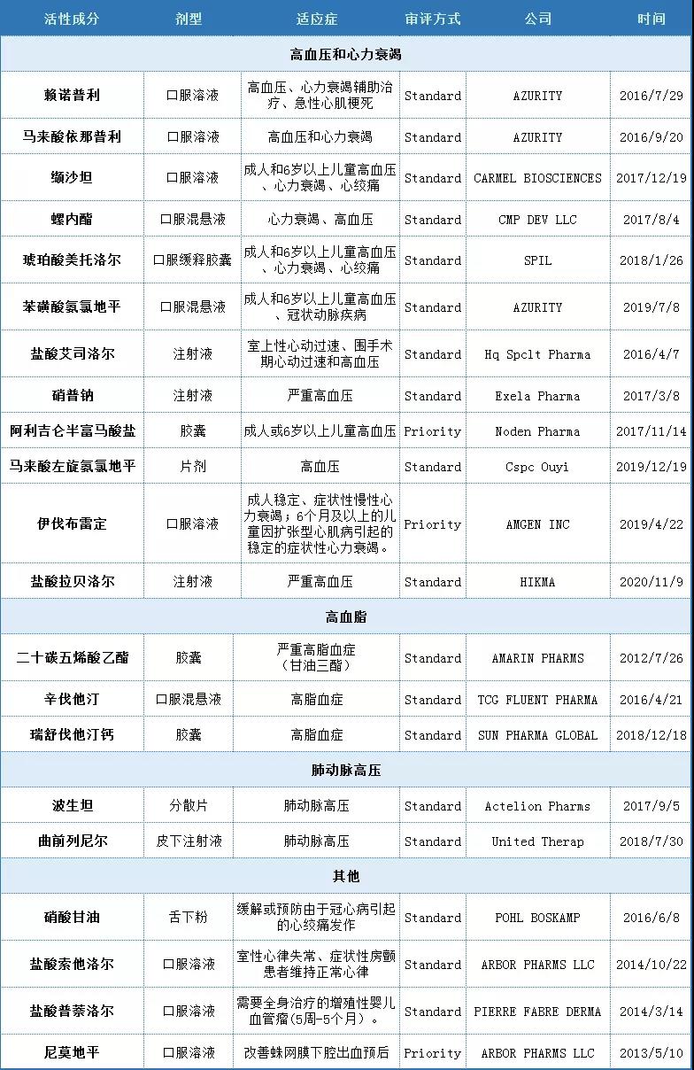 另外,該領(lǐng)域的較多品種均納入了《國家鼓勵(lì)研發(fā)申報(bào)的兒童藥品》,例如尼莫地平(第一批)、普萘洛爾(第二批)、氨氯地平(第二批)、依那普利(第三批)、索他洛爾(第三批)、螺內(nèi)酯(第三批)口服液體制劑等,建議企業(yè)可以重點(diǎn)關(guān)注。