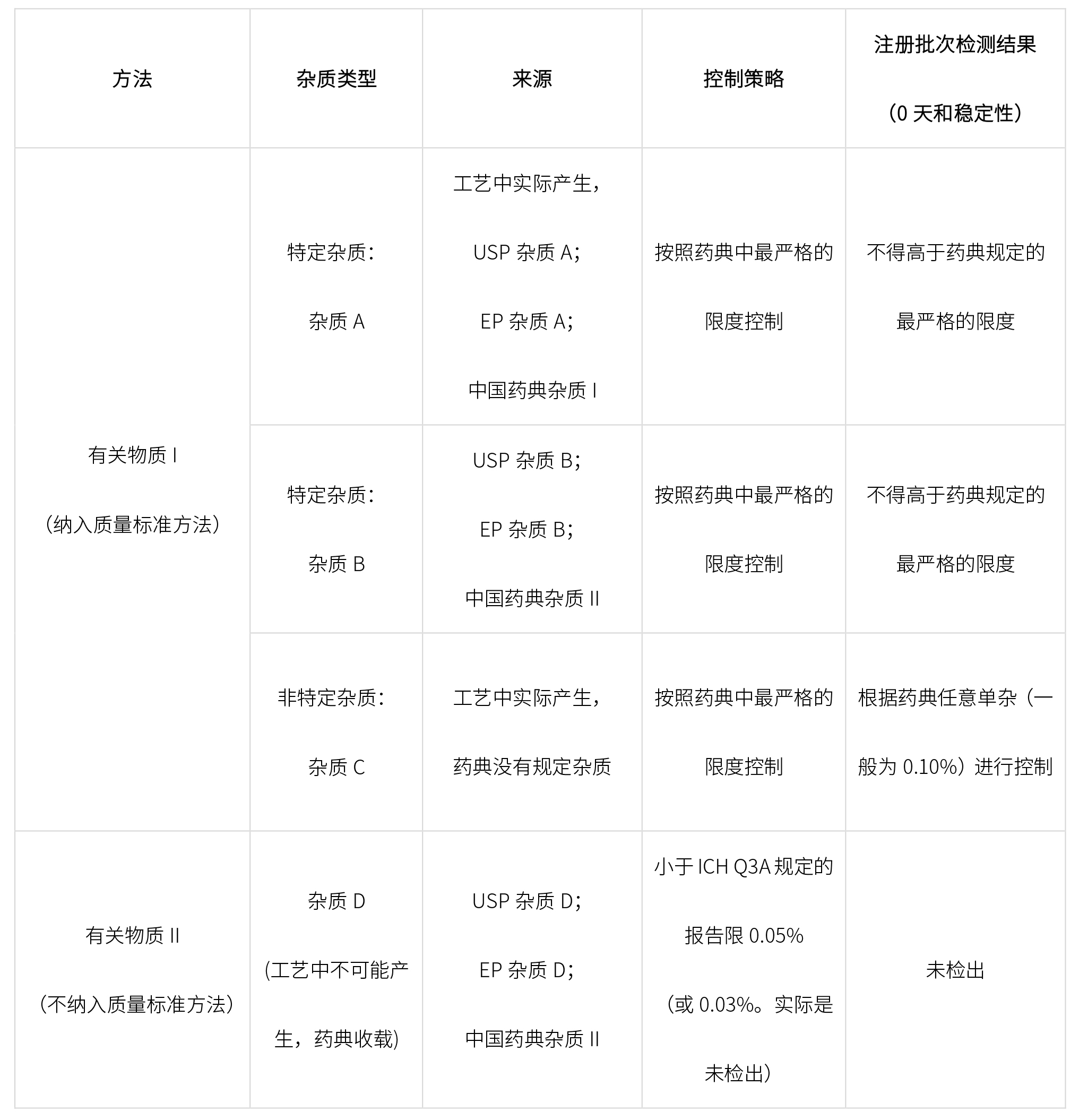 開發有關物質相關方法檢測上述有機雜質,雜質控制策略如下: