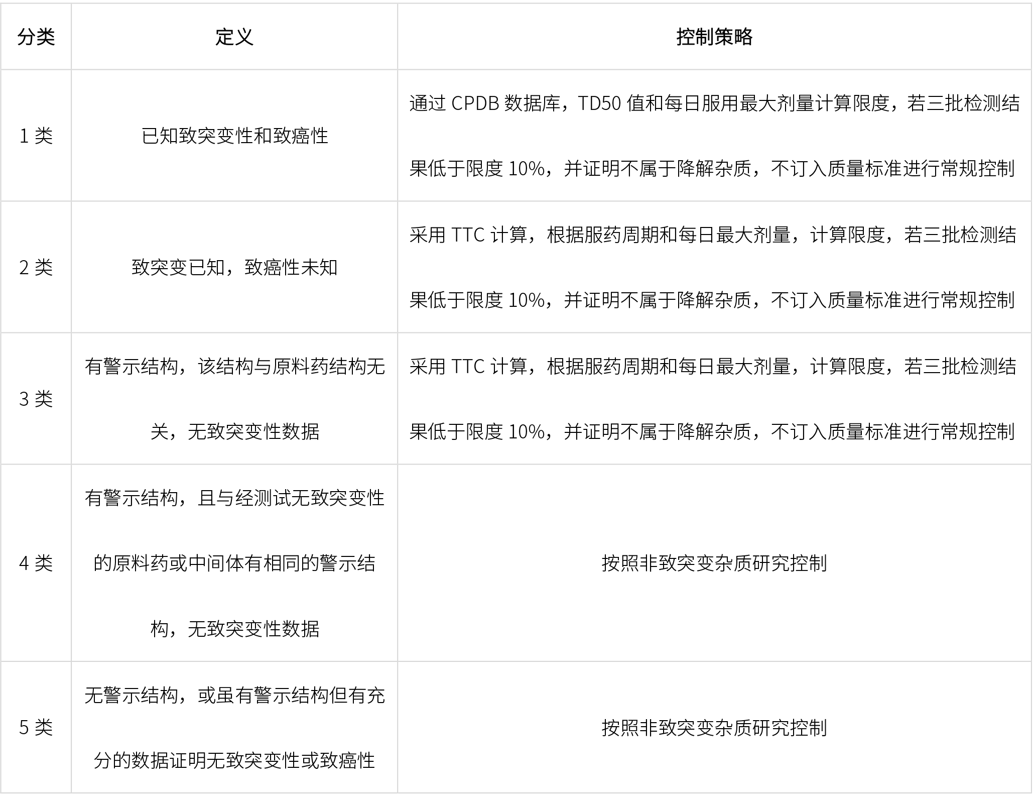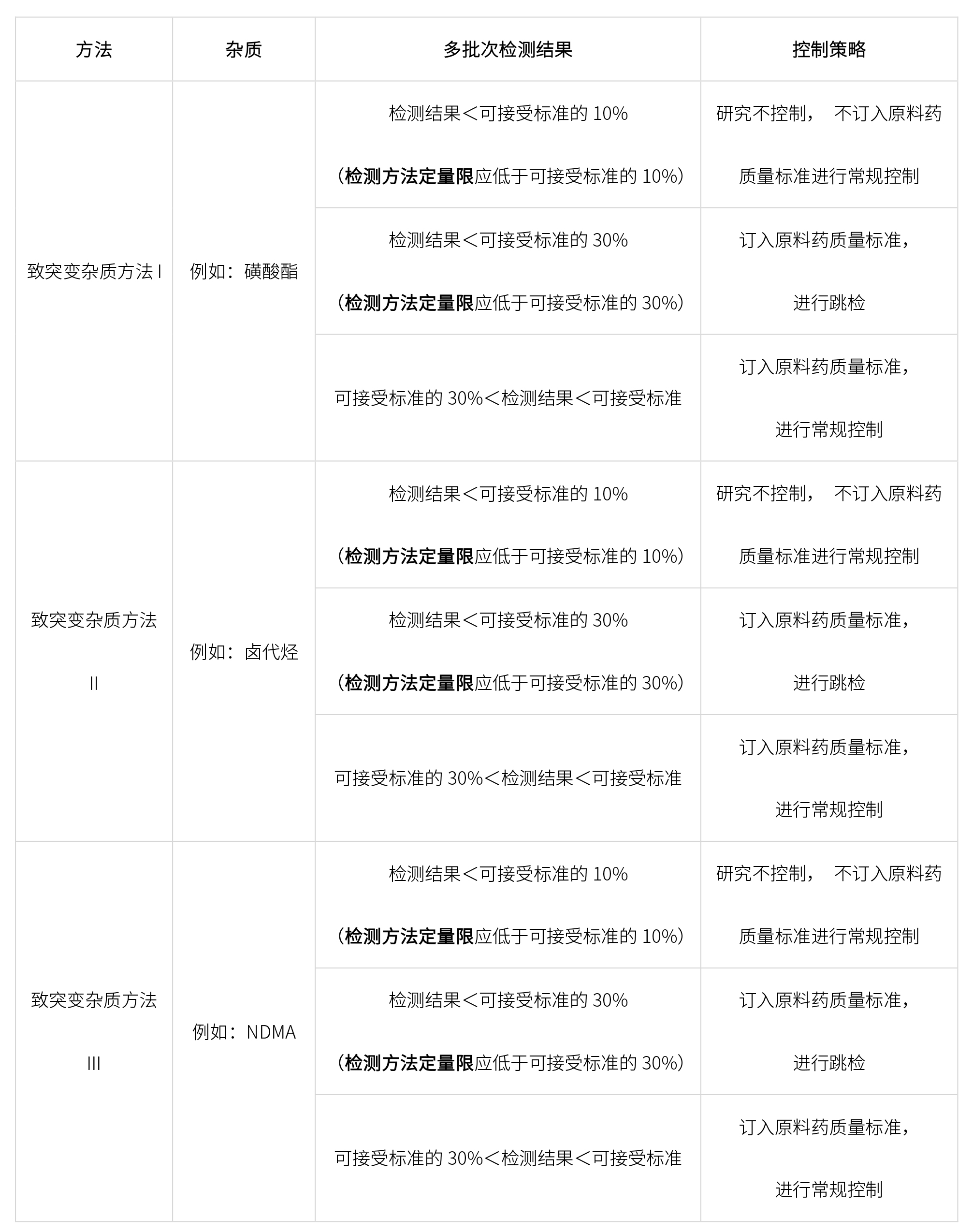 開發致突變雜質相關方法檢測原料藥中致突變雜質,雜質控制策略如下: