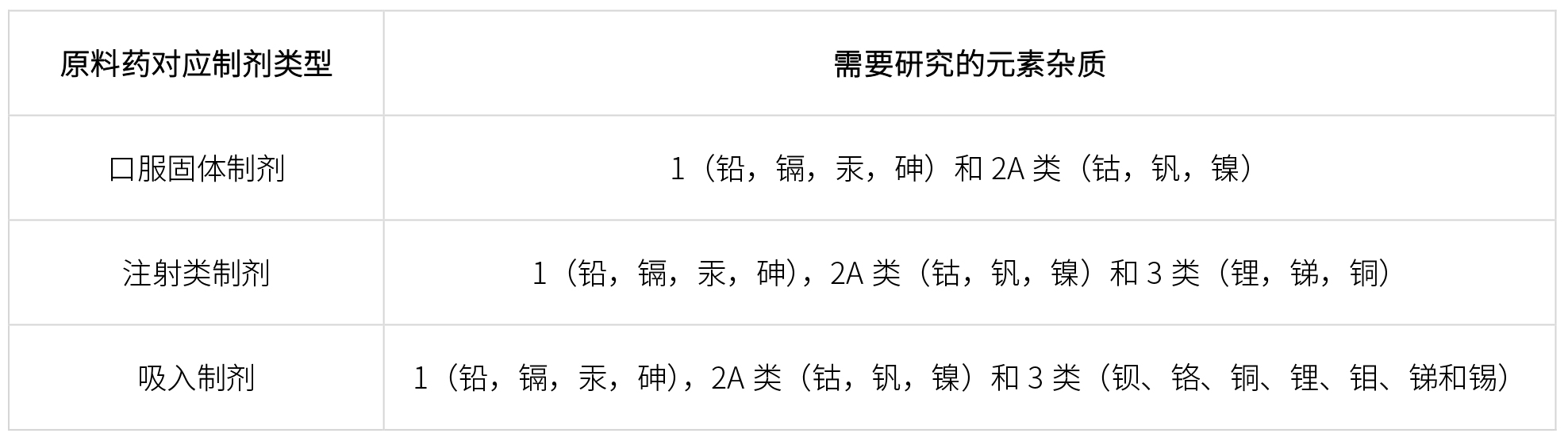 根據ICH Q3D指導原則,不同類型原料藥至少需要研究如下元素雜質: