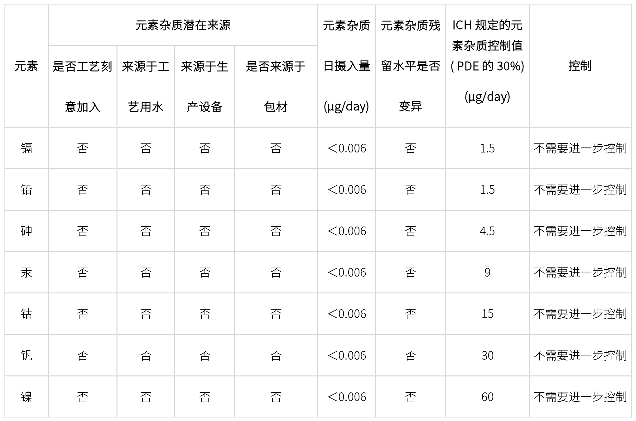 經過上述一系列風險評估和相關檢測數據,確定原料藥中元素雜質最終控制策略: