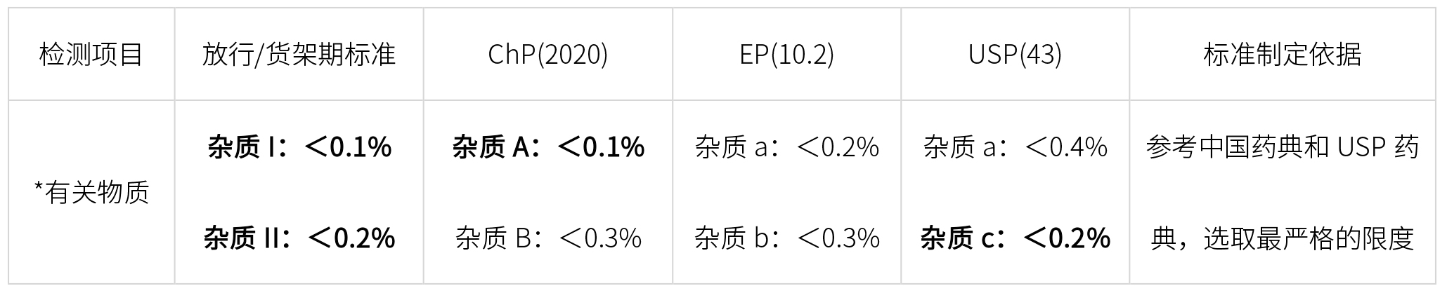 *特定雜質,藥典雜質編號可能不一樣,進行對比研究時,要一一對應。
