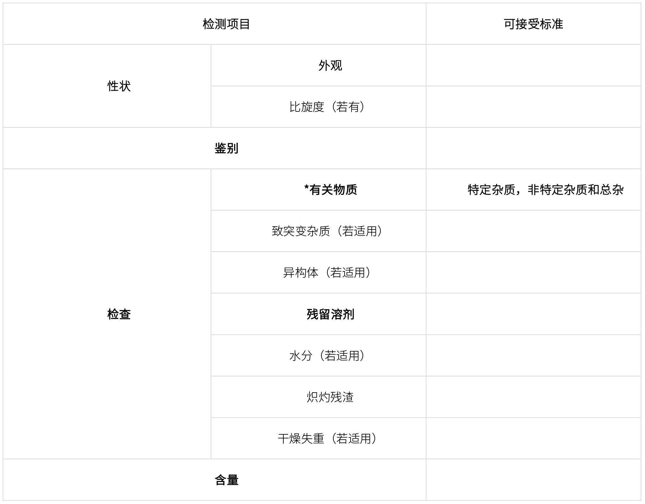 API質量標準,應參照所有相關藥典,檢測項目覆蓋所有藥典,檢測限度選取藥典最嚴格的限度制定,如下: