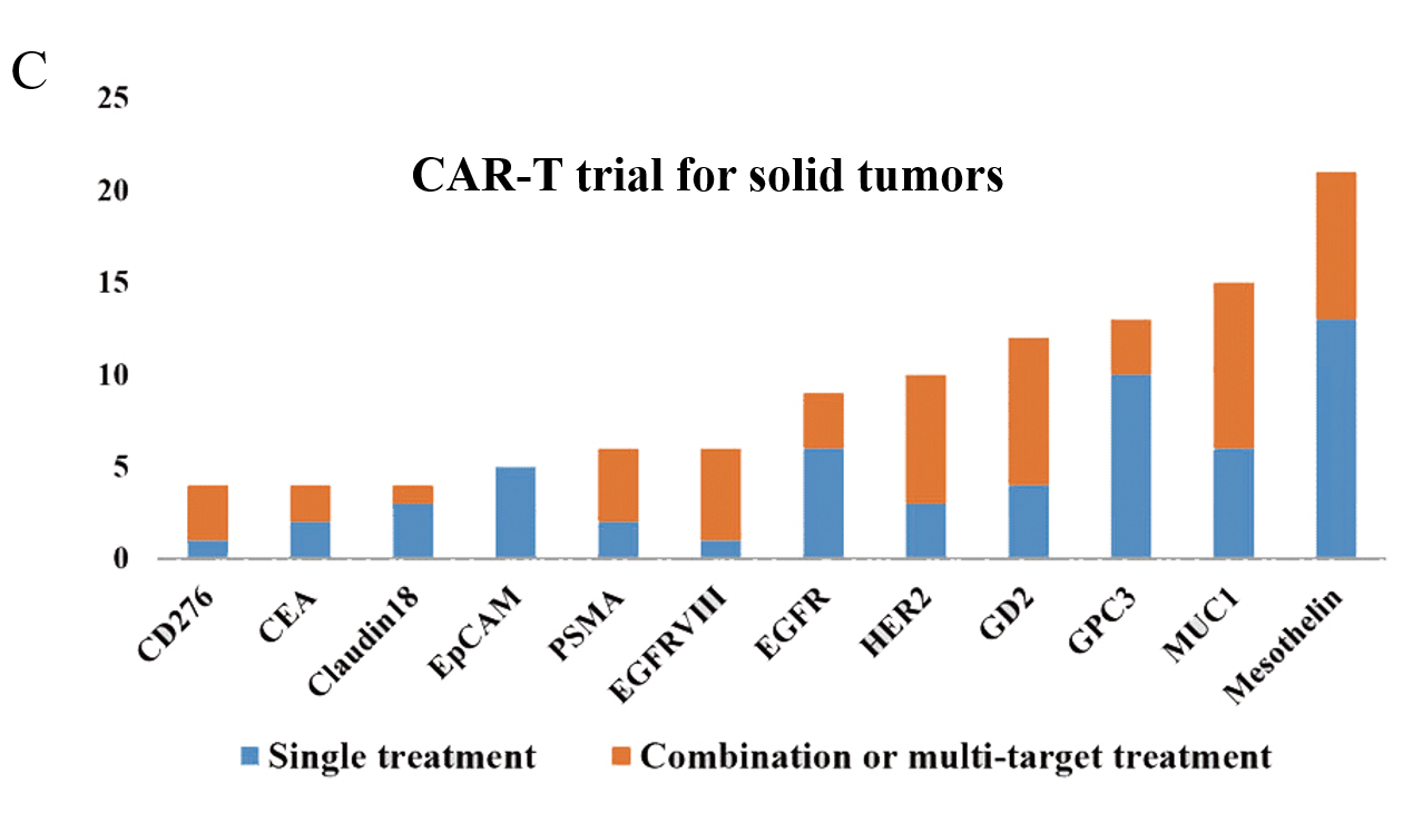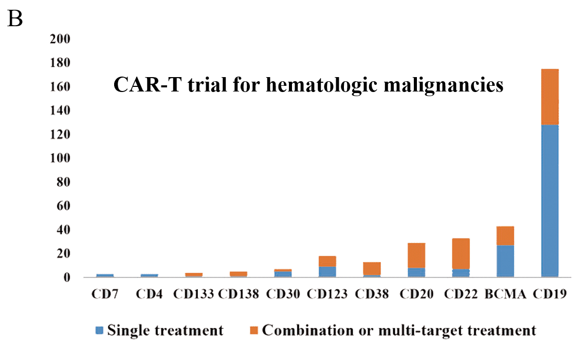 世界上第一個CAR-T臨床試驗于2003年在美國啟動,用于治療上皮性卵巢癌。在中國,第一個CAR-T試驗于2012年發布,旨在研究CD20靶向CAR-T細胞治療化療耐藥或難治的淋巴瘤患者的可行性。