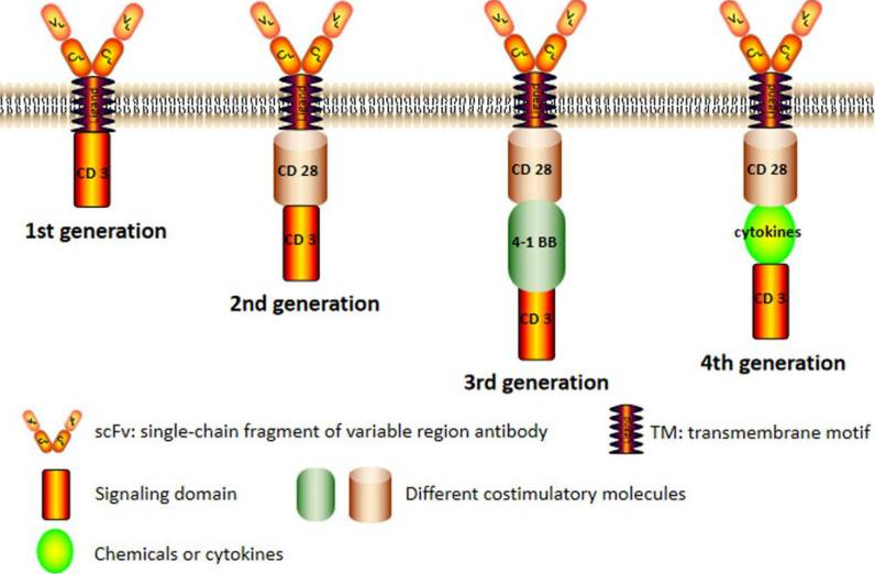 圖2:四代嵌合抗原受體(CAR)的結構[2]