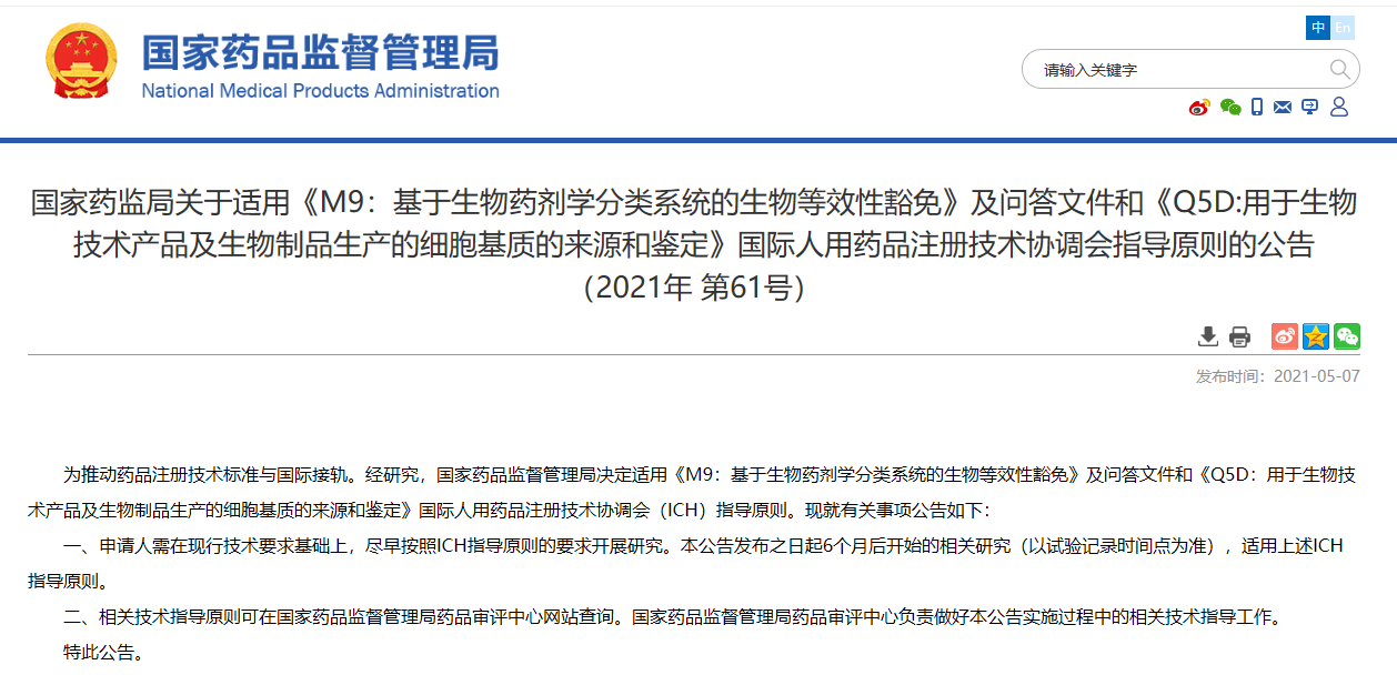 關于適用《M9:基于生物藥劑學分類系統的生物等效性豁免》及問答文件和《Q5D:用于生物技術產品及生物制品生產的細胞基質的來源和鑒定》國際人用藥品注冊技術協調會指導原則的公告(2021年 第61號)