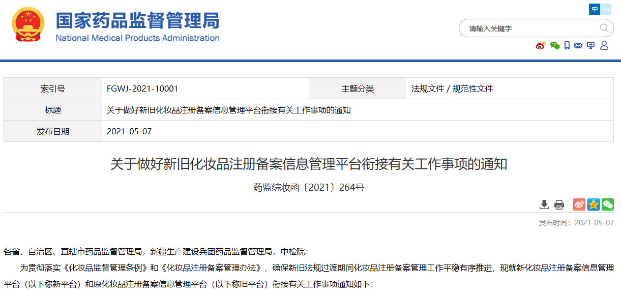 關于做好新舊化妝品注冊備案信息管理平臺銜接有關工作事項的通知
