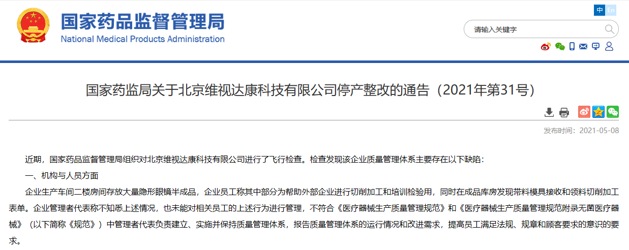 關于北京維視達康科技有限公司停產整改的通告(2021年第31號)