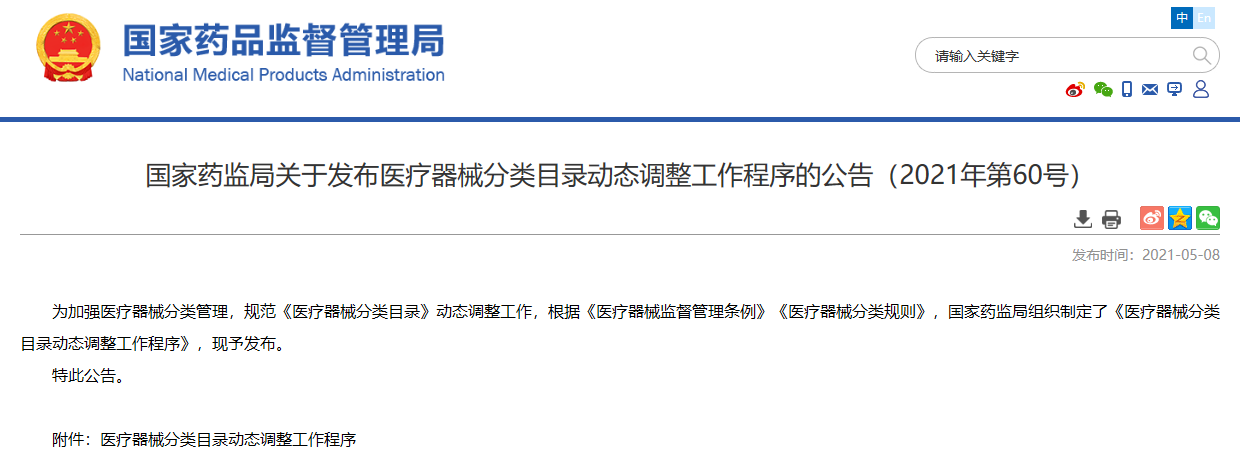 關于發布醫療器械分類目錄動態調整工作程序的公告(2021年第60號)