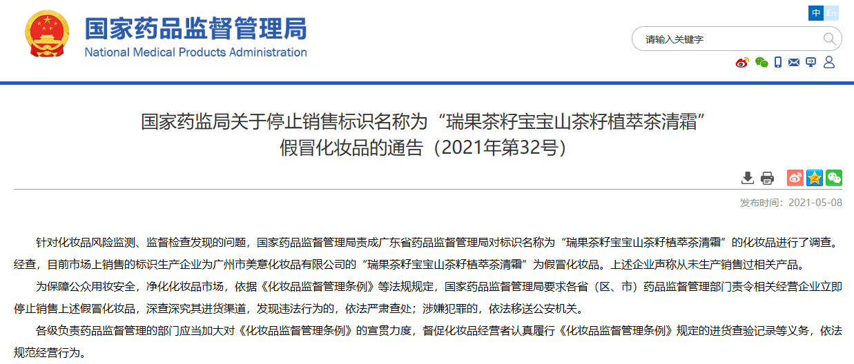 關于停止銷售標識名稱為“瑞果茶籽寶寶山茶籽植萃茶清霜”假冒化妝品的通告(2021年第32號)