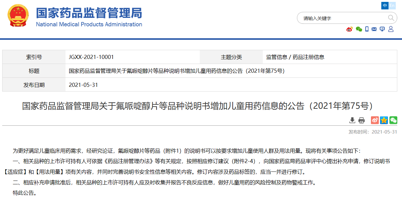 國家藥品監督管理局關于氟哌啶醇片等品種說明書增加兒童用藥信息的公告(2021年第75號)