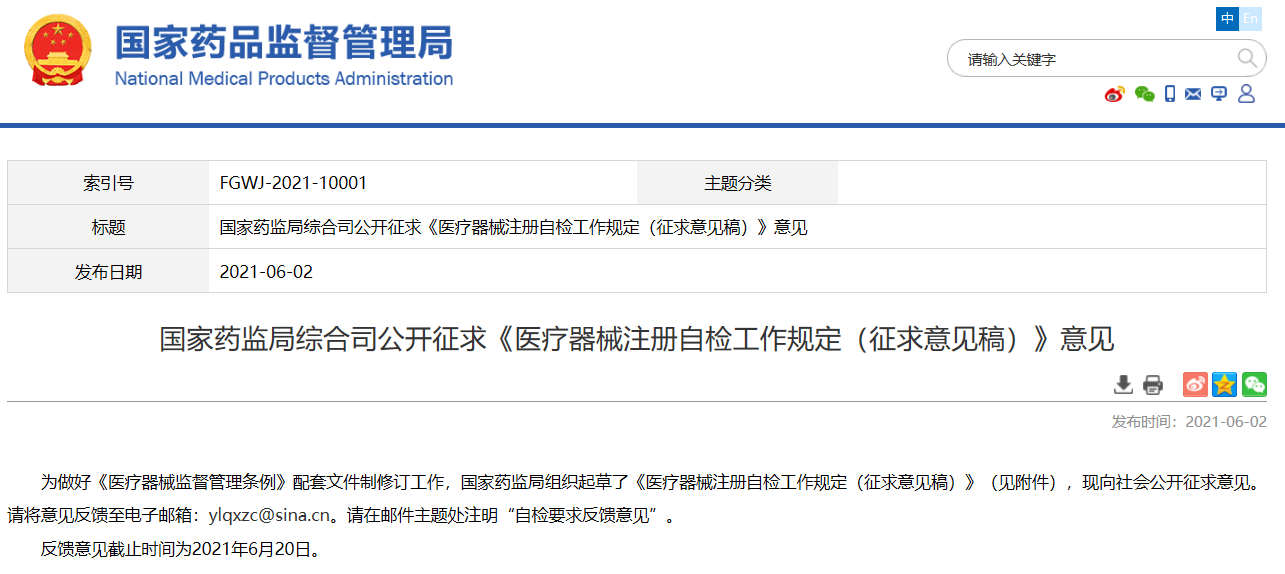 國家藥監局綜合司公開征求《醫療器械注冊自檢工作規定(征求意見稿)》意見