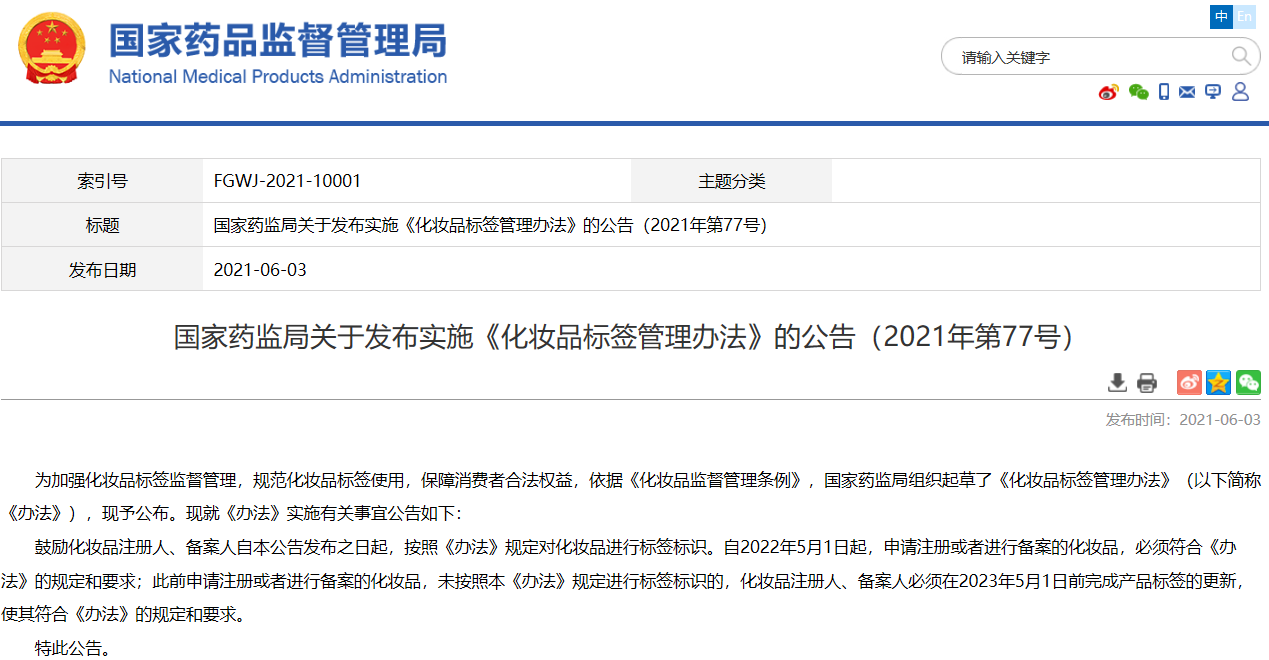 國家藥監局關于發布實施《化妝品標簽管理辦法》的公告(2021年第77號)