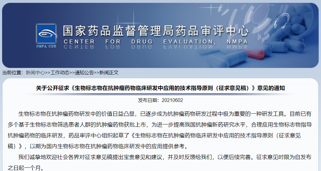 關于公開征求《生物標志物在抗腫瘤藥物臨床研發中應用的技術指導原則(征求意見稿)》意見的通知