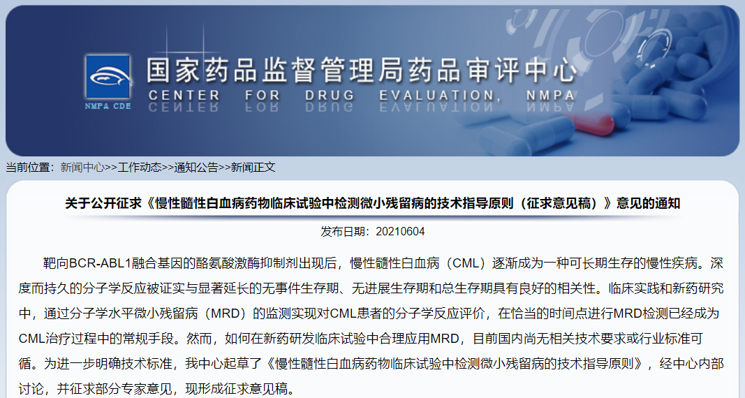 關于公開征求《慢性髓性白血病藥物臨床試驗中檢測微小殘留病的技術指導原則(征求意見稿)》意見的通知