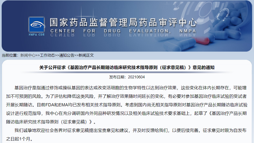 關于公開征求《基因治療產品長期隨訪臨床研究技術指導原則(征求意見稿)》意見的通知