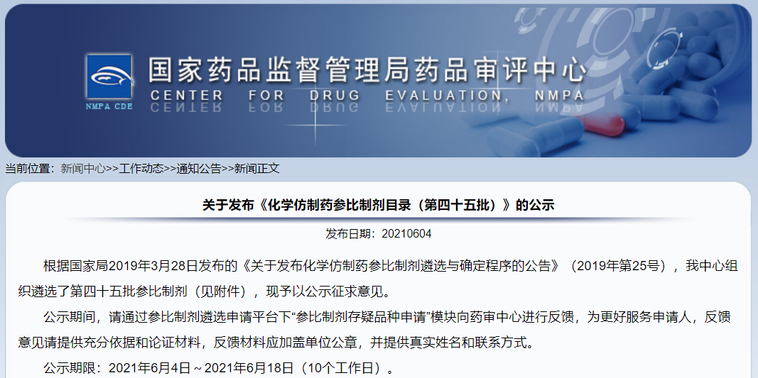 關于發布《化學仿制藥參比制劑目錄(第四十五批)》的公示