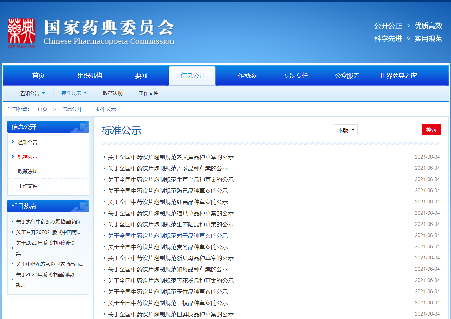 本周全國中藥飲片炮制規范熟大黃品種、全國中藥飲片炮制規范丹參品種、全國中藥飲片炮制規范生草烏品種、全國中藥飲片炮制規范防己品種、全國中藥飲片炮制規范紅芪品種、全國中藥飲片炮制規范貓爪草品種、全國中藥飲片炮制規范生商陸品種、全國中藥飲片炮制規范射干品種、全國中藥飲片炮制規范麥冬品種、全國中藥飲片炮制規范浙貝母品種、全國中藥飲片炮制規范知母品種、全國中藥飲片炮制規范天花粉品種、全國中藥飲片炮制規范玉竹品種、全國中藥飲片炮制規范三棱品種、全國中藥飲片炮制規范白鮮皮品種、全國中藥飲片炮制規范白茅根品種、全國中藥飲片炮制規范酒白芍品種、全國中藥飲片炮制規范炒白芍品種、全國中藥飲片炮制規范白芍品種、全國中藥飲片炮制規范皂角刺品種、全國中藥飲片炮制規范赤石脂品種、全國中藥飲片炮制規范肉蓯蓉品種草案公示;阿莫西林顆粒國家、碳酸鋰緩釋片、碳酸鋰片、混合核苷片、混合核苷國家藥品標準草案公示;混合脂肪酸甘油酯(硬脂)、硬脂酸鈣藥用輔料標準草案公示。