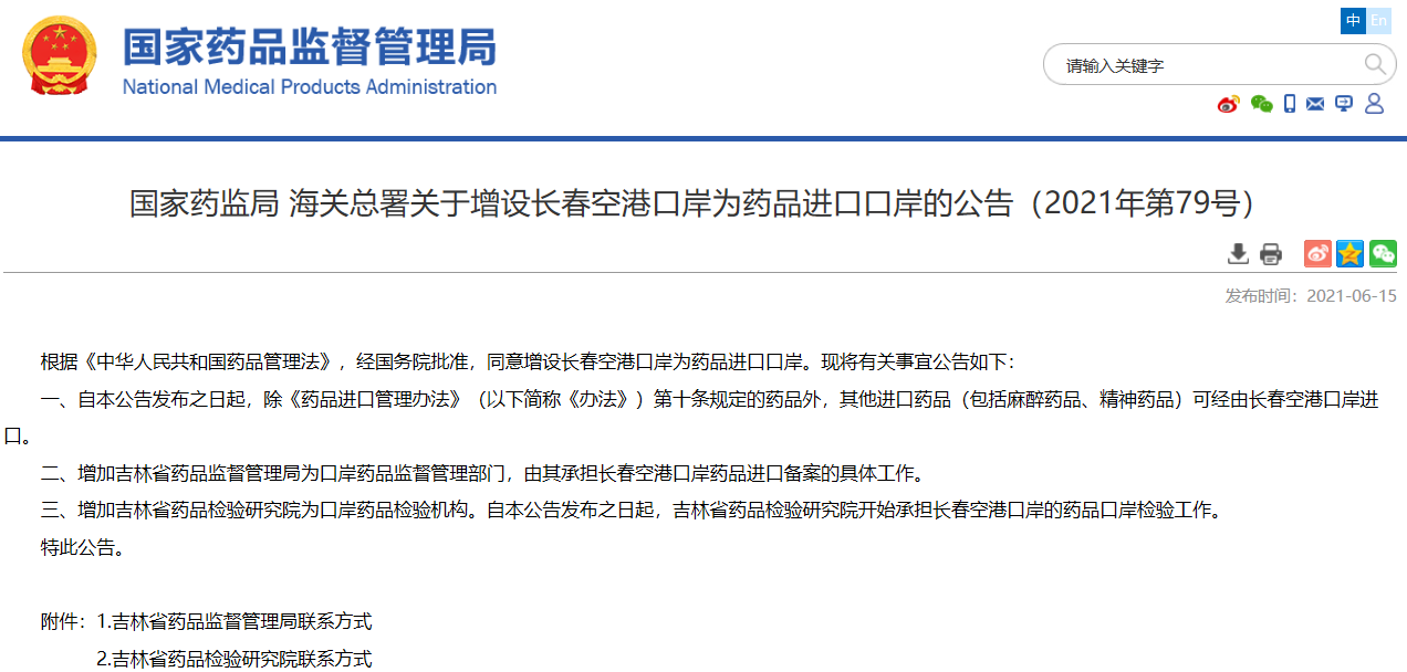 國家藥監局 海關總署關于增設長春空港口岸為藥品進口口岸的公告(2021年第79號)