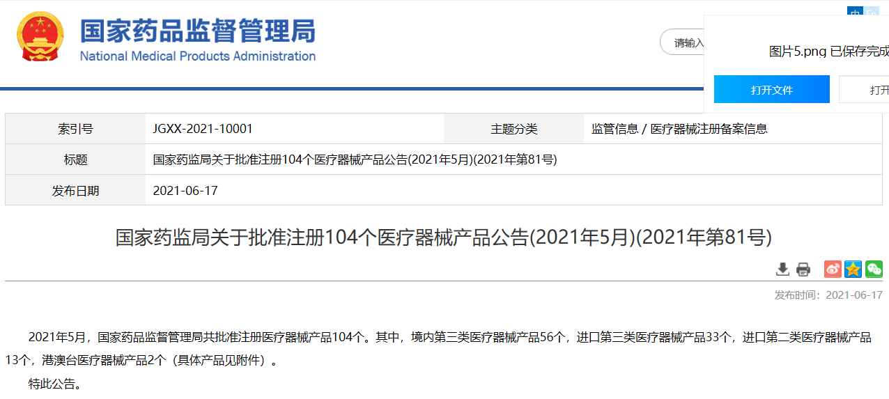 國家藥監局關于批準注冊104個醫療器械產品公告(2021年5月)(2021年第81號)