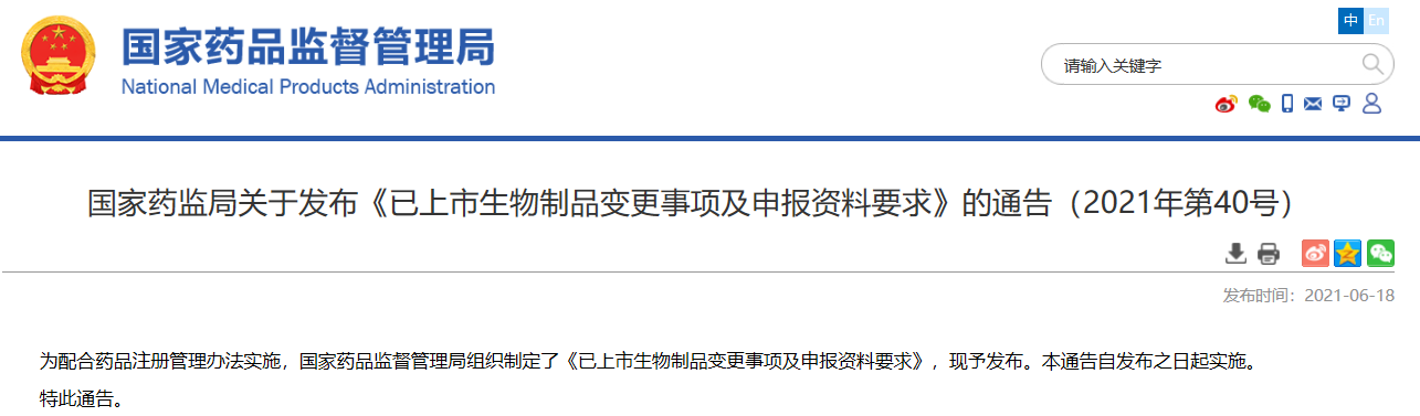 國家藥監局關于發布《已上市生物制品變更事項及申報資料要求》的通告(2021年第40號)