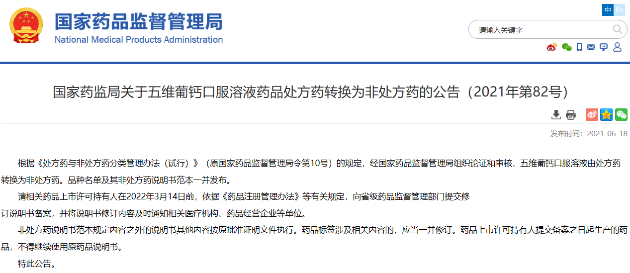 國家藥監局關于五維葡鈣口服溶液藥品處方藥轉換為非處方藥的公告(2021年第82號)