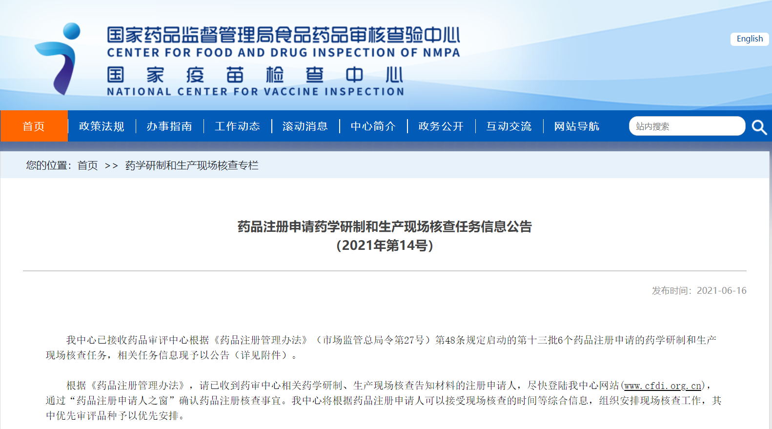 藥品注冊申請藥學研制和生產現場核查任務信息公告(2021年第14號)