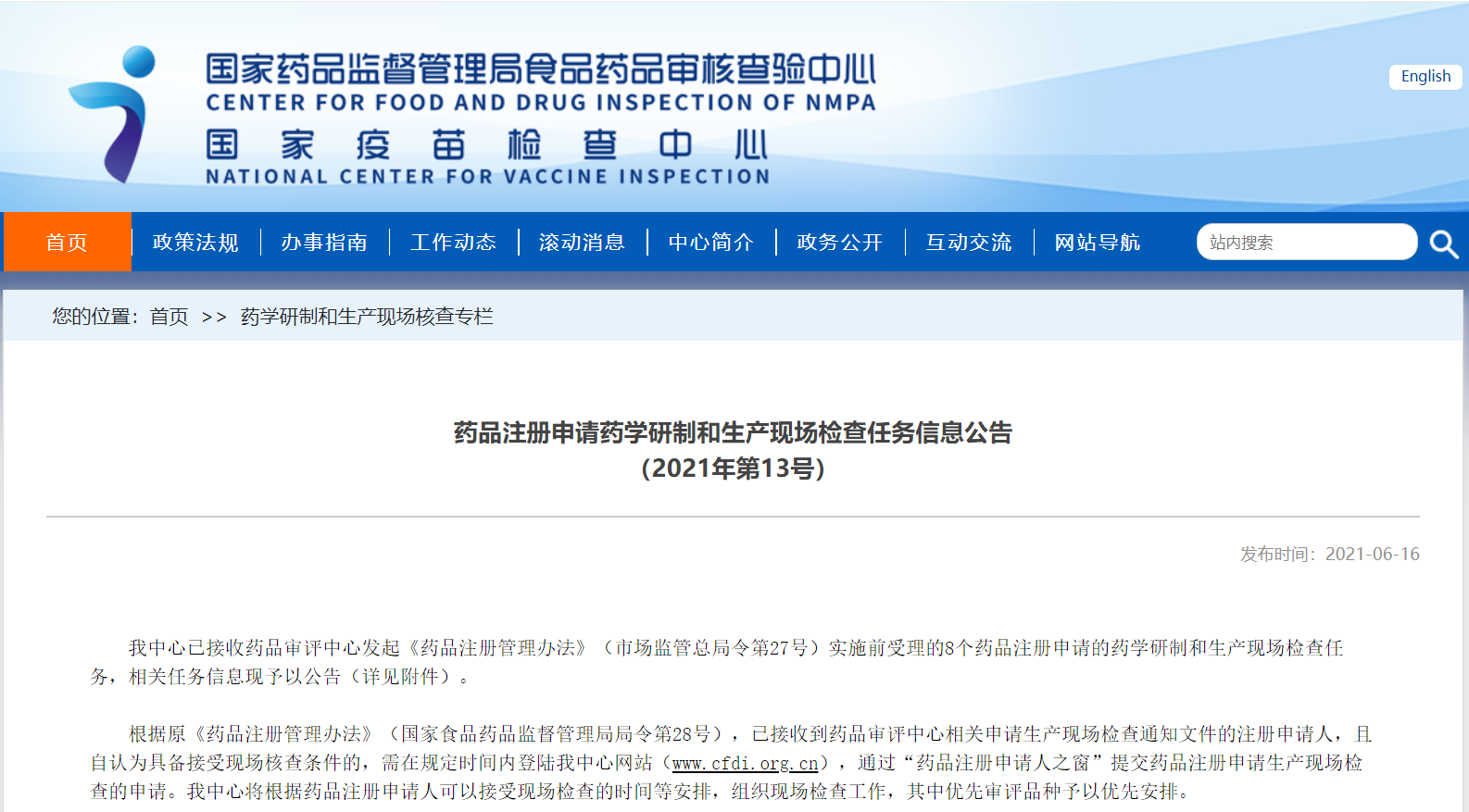 藥品注冊申請藥學研制和生產現場檢查任務信息公告(2021年第13號)