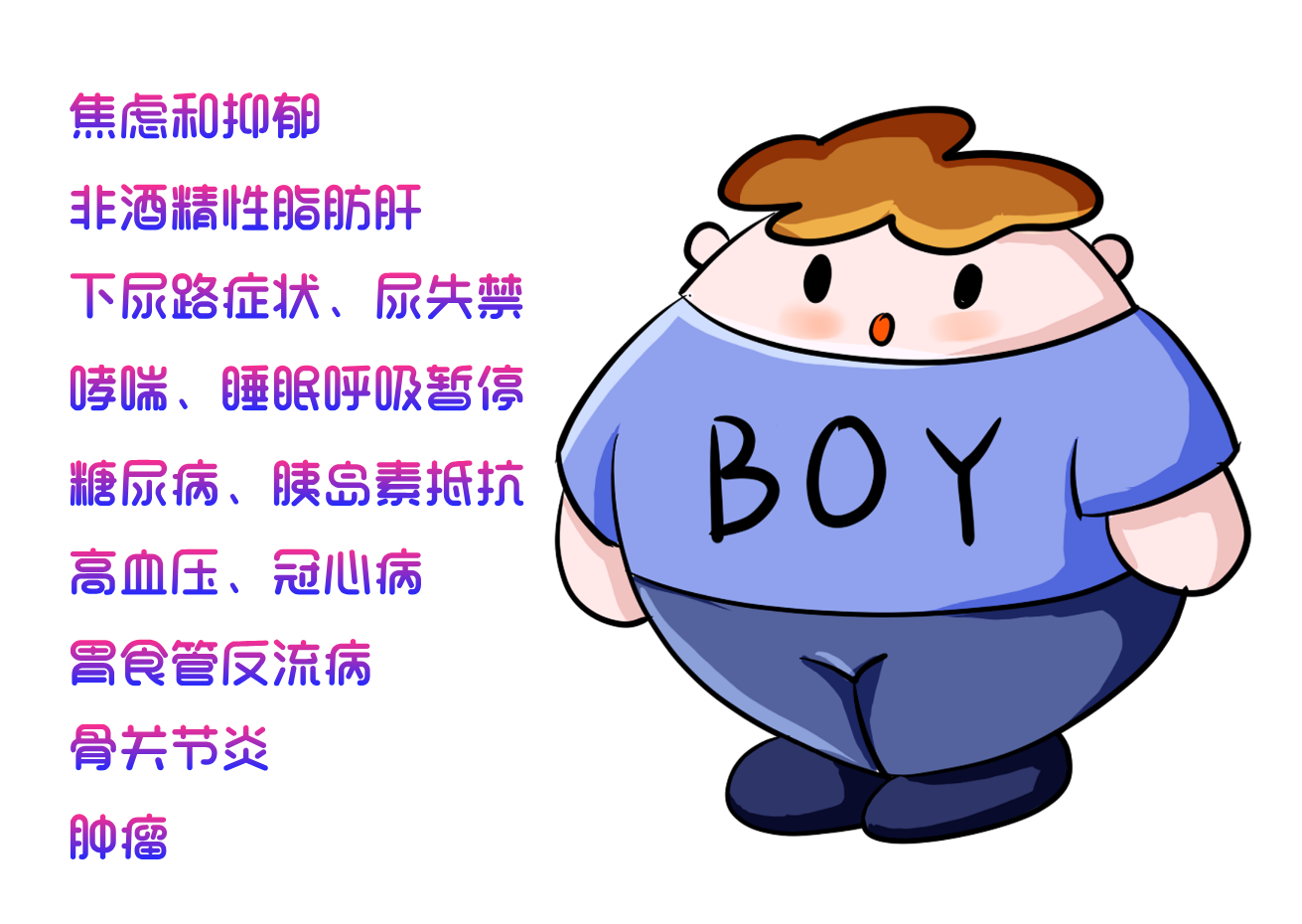 超重和肥胖是一種由多因素引起的以體內脂肪過度蓄積為特征的慢性代謝性疾病,其發病機制包括遺傳、代謝、環境和行為因素等,除少數由于疾病導致的肥胖外,絕大多數的超重和肥胖是能量的攝入超過能量消耗以致體內脂肪過多蓄積的結果。超重和肥胖可顯著增加心腦血管、呼吸、內分泌、消化、骨骼、生殖及精神等多系統疾病的風險并且嚴重影響生活質量。
