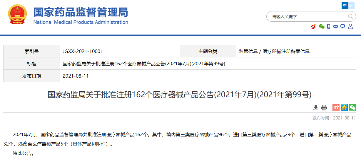 關(guān)于批準(zhǔn)注冊(cè)162個(gè)醫(yī)療器械產(chǎn)品公告(2021年7月)(2021年第99號(hào))