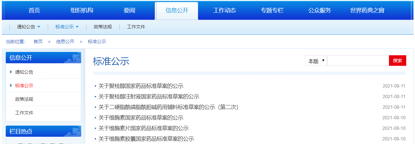 本周聚桂醇、聚桂醇注射液、維酶素、維酶素片、維酶素膠囊國(guó)家藥品標(biāo)準(zhǔn)草案公示,二硬脂酰磷脂酰膽堿藥用輔料標(biāo)準(zhǔn)草案公示。