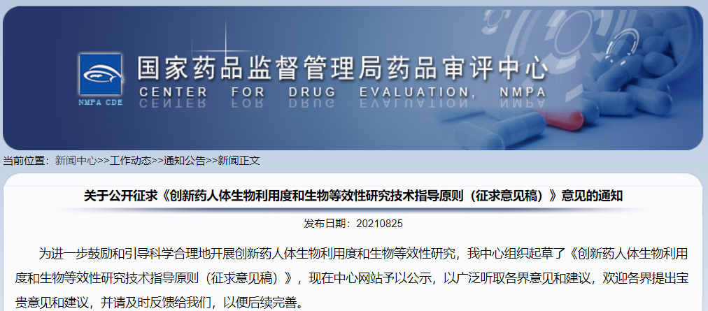 關于公開征求《創新藥人體生物利用度和生物等效性研究技術指導原則(征求意見稿)》意見的通知