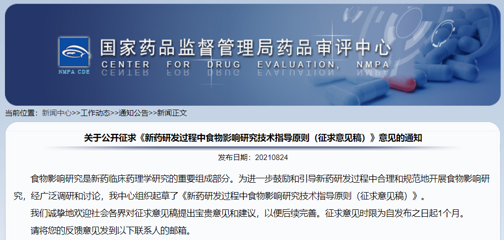 關于公開征求《新藥研發過程中食物影響研究技術指導原則(征求意見稿)》意見的通知