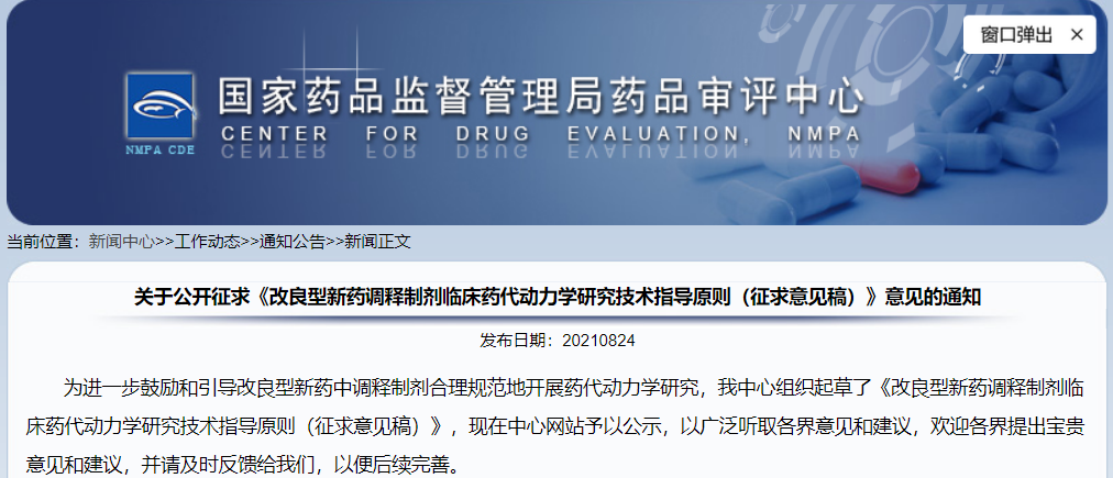 關于公開征求《改良型新藥調釋制劑臨床藥代動力學研究技術指導原則(征求意見稿)》意見的通知